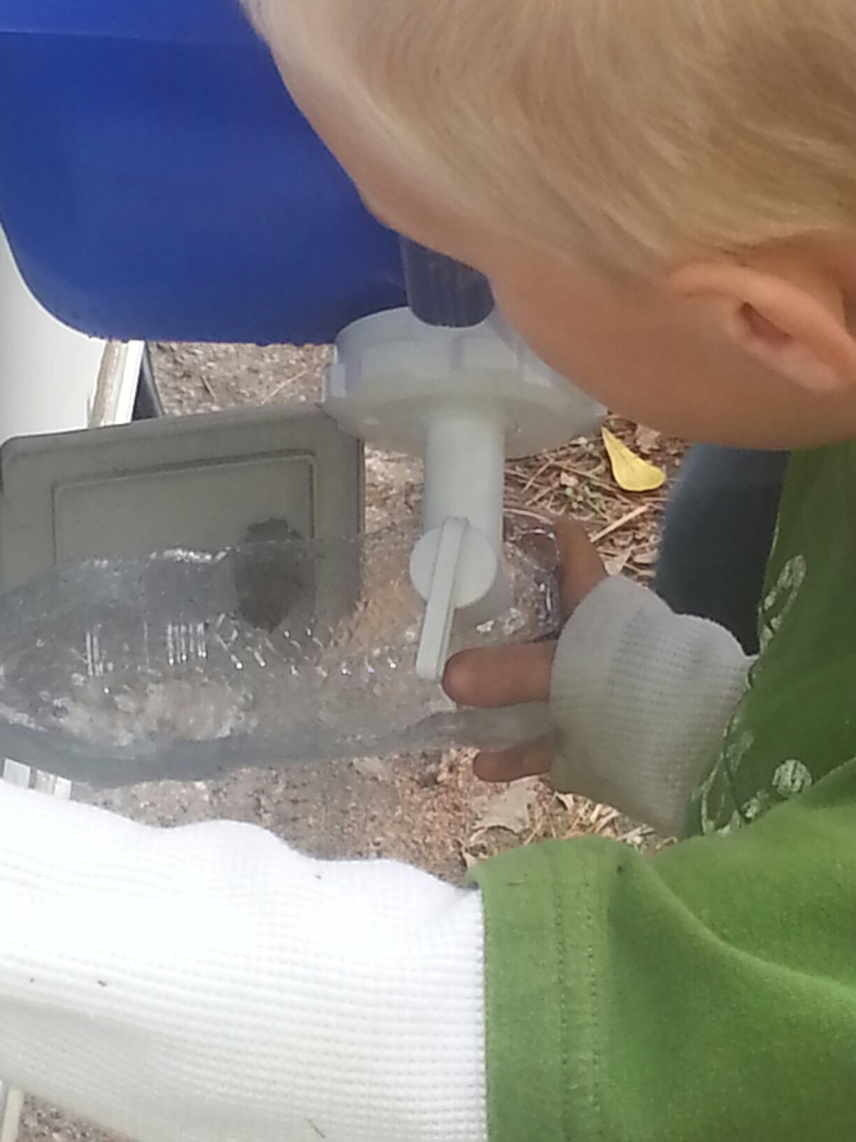One must have water! Part of boondocking (which is cheaper than upscale campgrounds) is giving up electricity and water. Fortunately our campsite is near a water faucet. Jim came up with a clever way to funnel the water into the water inlet of the camper. Jim figures that he carried 108 pounds of water on the water faucet to the camper. That is his work out for the day and now a much deserved refreshing adult beverage! And later –
