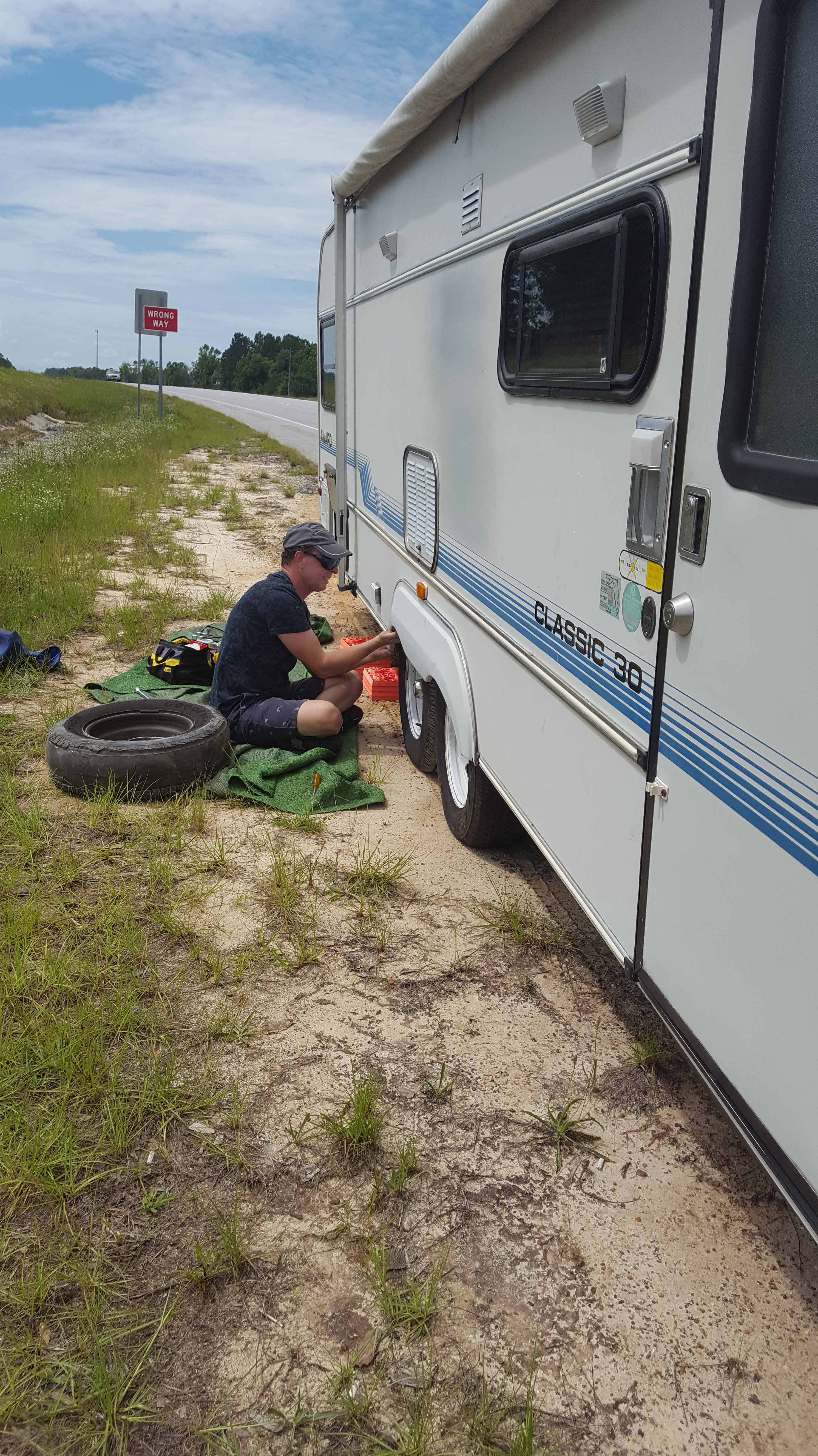 Thump, thump. Flat tire on US1! The front left passenger side of the camper suffered a flat tire. Actually, flat is an understatement-it was shredded. Not to worry, Capt. Jim was totally prepared. The best tool he carried was an impact wrench, as it made quick work of the lugnuts. He was a Pit Stop Demon!