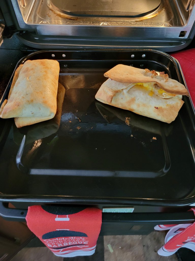 Breakfast for travel days needs to be quick and easy. Before we left, I put together breakfast burritos. I kept them simple sausage cheese and eggs.